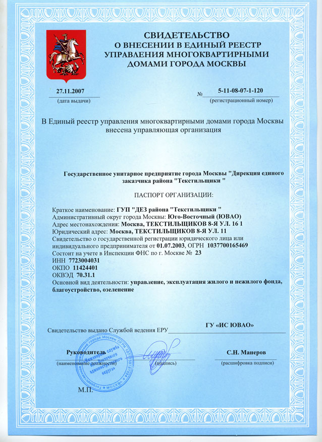 Свидетельство о внесении в единый реестр управления многоквартирными домами города Москвы